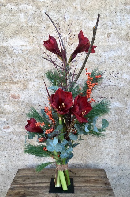 Julens smukke røde amaryllis bundet med grene og julegrønt.En klassiker fra Blomst & Gren.