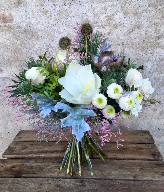 En romantisk vinterbuket i lækre hvide/pastelfarver, bundet med naturmaterialer og et hint af glimmer.